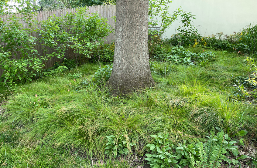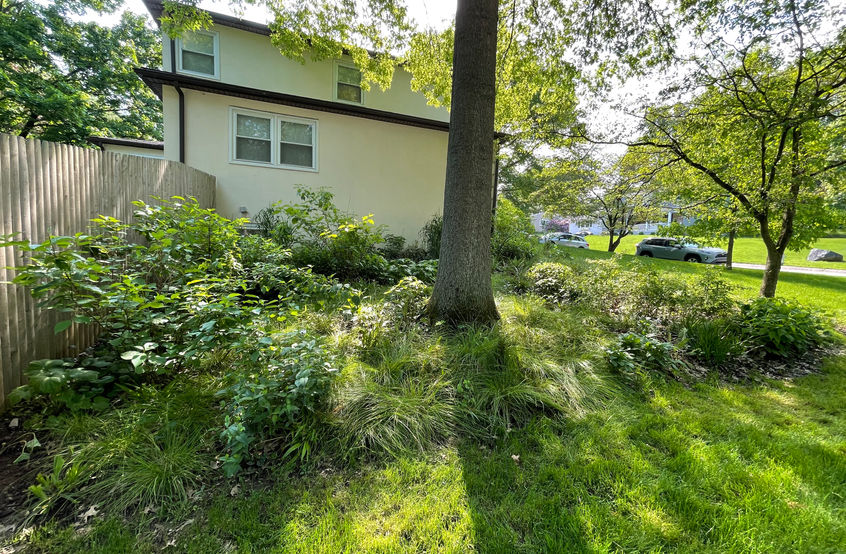 A diverse native palette (with Allium 'Summer Beauty' and Stachy's 'Hummelo', client favorites from MLSN) replaced a shady patch of lawn and mostly ground ivy beneath a large oak.